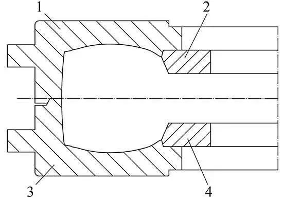工業輪胎模具導向機構的導向面為圓錐面的稱為圓錐面式活絡模具,與斜平面相比,圓錐面有良好的可加工性,普通的機床可滿足精度要求。圓錐面式模具的裝配精度要求較低,模具零件磨損后,周向偏差能夠自動補償,對硫化輪胎圓度影響小,對輪胎的膠邊和錯花問題影響也不明顯。但是模具開合過程中,弓形座和中模套上的耐磨板由線接觸逐漸過渡到圓錐面接觸,造成耐磨板不均勻磨損、模具動作不平穩以及對硫化機的適應性低。